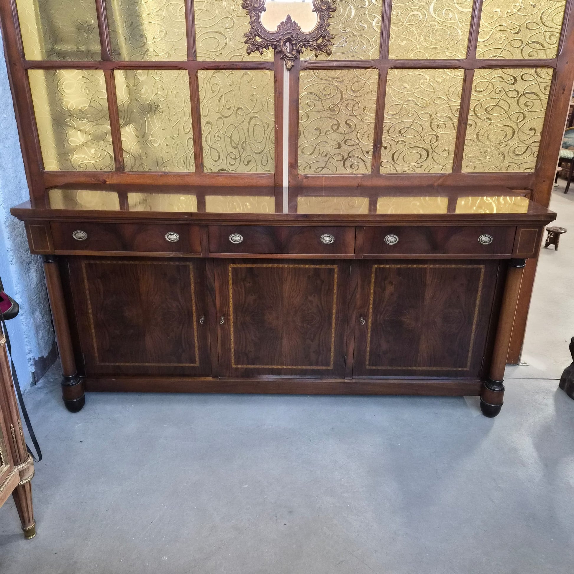 Cuenta con una amplia superficie superior pulida y brillante, perfecta para exponer piezas decorativas. En la parte frontal dispone de cajones con tiradores metálicos y puertas inferiores que ofrecen un generoso espacio de almacenaje. Sus columnas laterales torneadas y el cuidado trabajo de marquetería realzan su diseño.