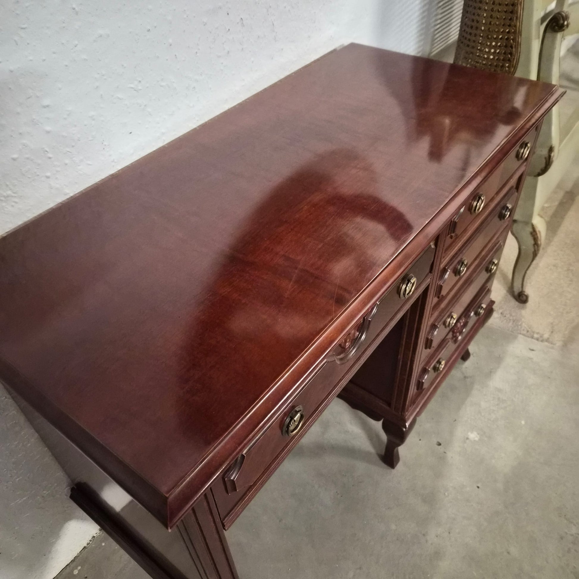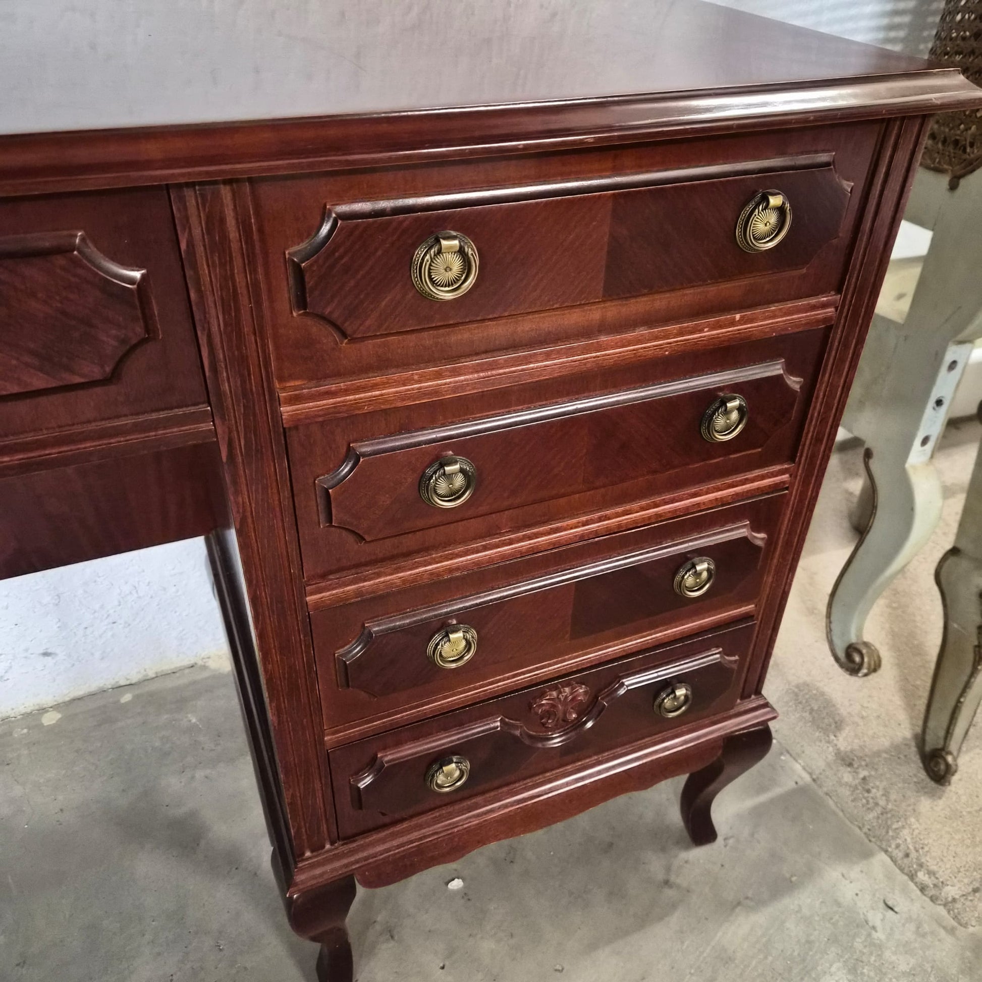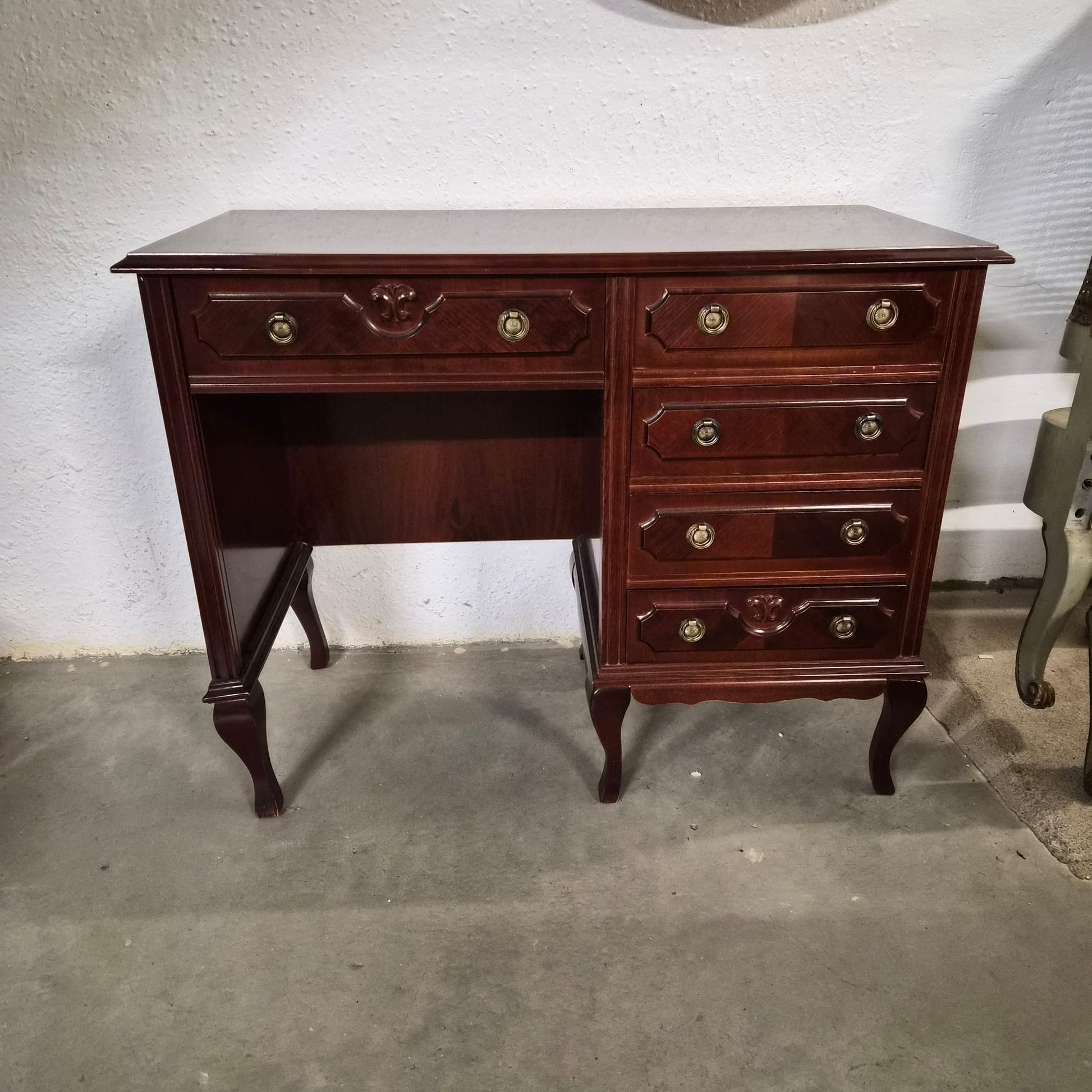 Elegante pequeño escritorio de estilo clásico, fabricado en madera maciza con acabado pulido en tono caoba. La pieza presenta una estructura equilibrada y funcional, con un sobre rectangular de líneas limpias y una cajonera lateral compuesta por varios cajones, que aporta una excelente capacidad de almacenaje sin renunciar a la estética.