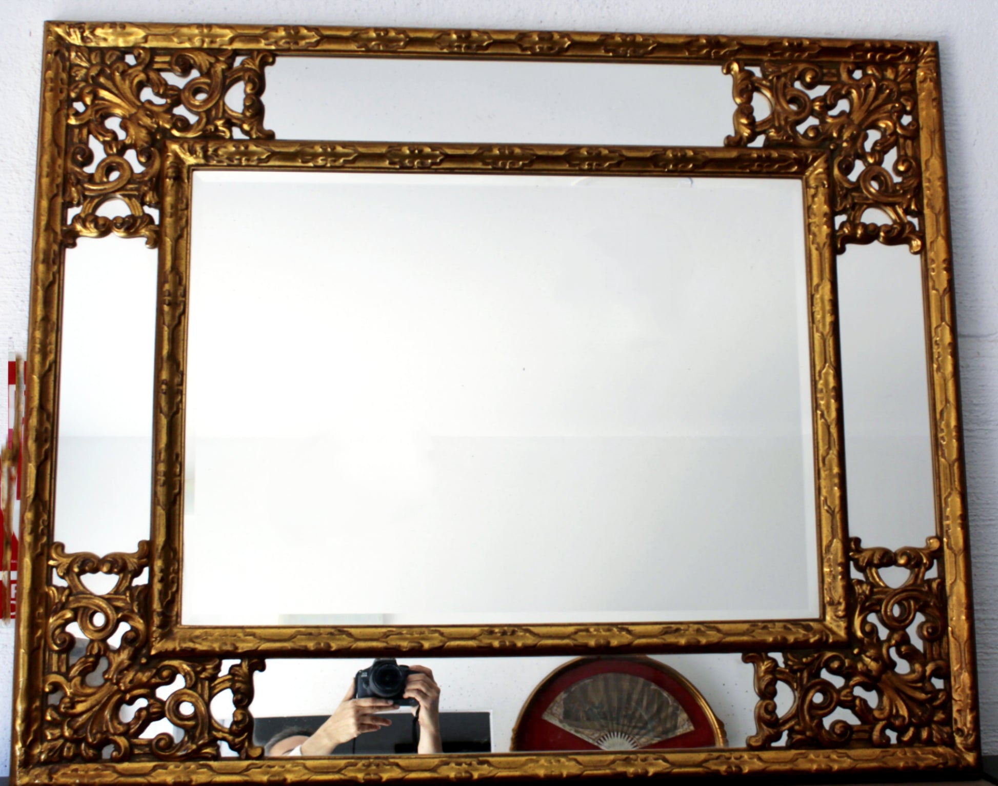 Aporta un toque de sofisticación a tu hogar con este hermoso espejo de estilo vintage. Su marco dorado, finamente tallado con detalles ornamentales, evoca el encanto de épocas pasadas, ideal para quienes buscan una pieza única de decoración.
