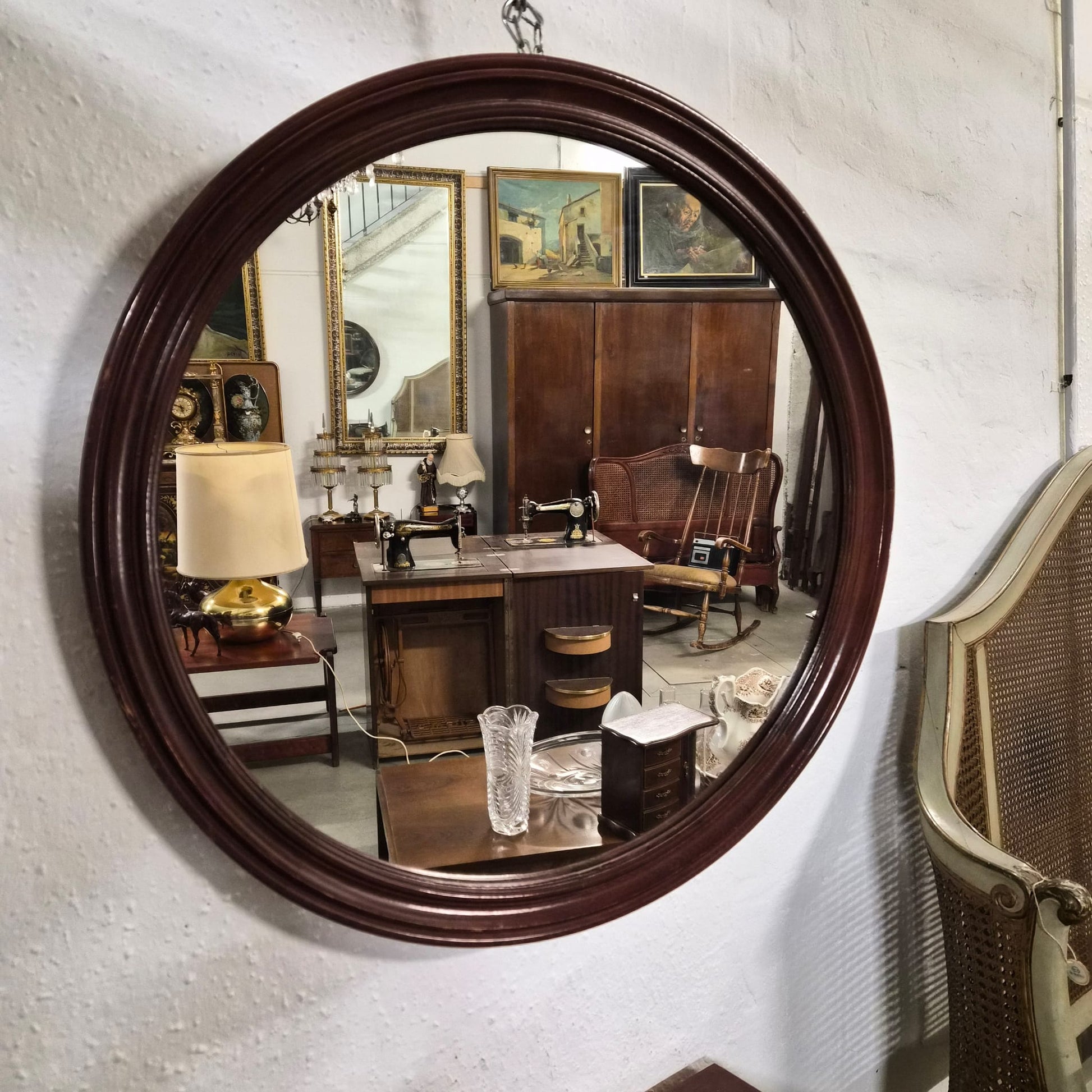 Elegante espejo redondo antiguo con marco de madera maciza en tono oscuro, cuidadosamente moldurado y con un acabado pulido que realza la veta natural de la madera. Su diseño sobrio y equilibrado lo convierte en una pieza atemporal, fácil de integrar en una amplia variedad de estilos decorativos.