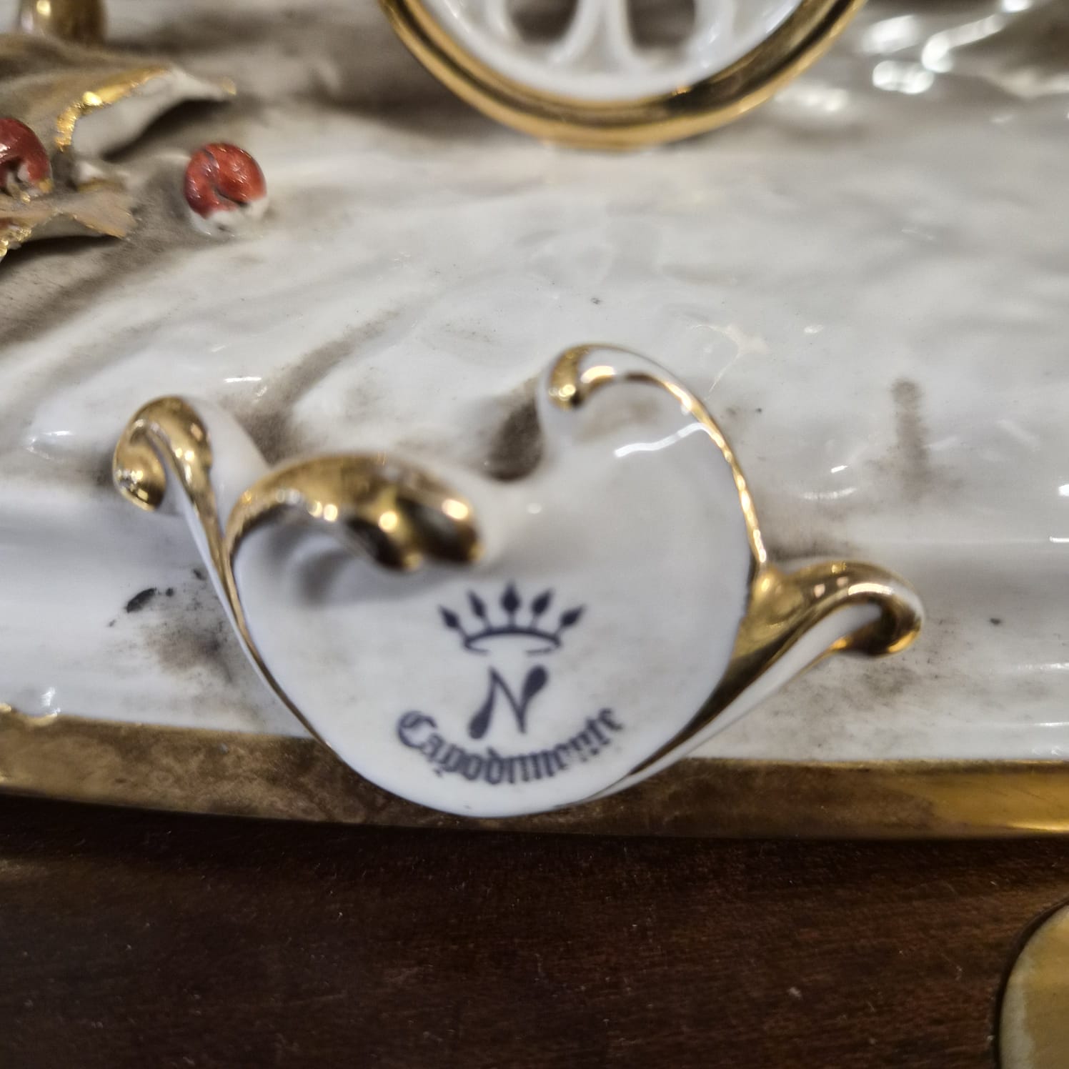 Realizada en porcelana esmaltada en blanco con aplicaciones en dorado y delicados toques policromados, esta obra evoca la estética romántica y aristocrática de finales del siglo XIX. Presenta marca visible en la base Capodimonte, reconocida internacionalmente por su excelencia artesanal y valor coleccionista.