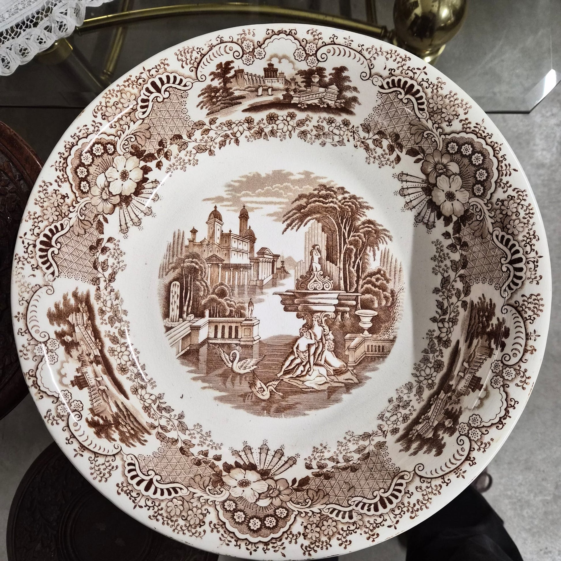 Ambas piezas presentan una cuidada decoración transferida en tono sepia, con escenas paisajísticas de inspiración clásica —arquitecturas, jardines y figuras— enmarcadas por una rica orla floral y geométrica. El diseño, equilibrado y elegante, es característico de la producción histórica de La Cartuja destinada tanto al uso doméstico como decorativo.