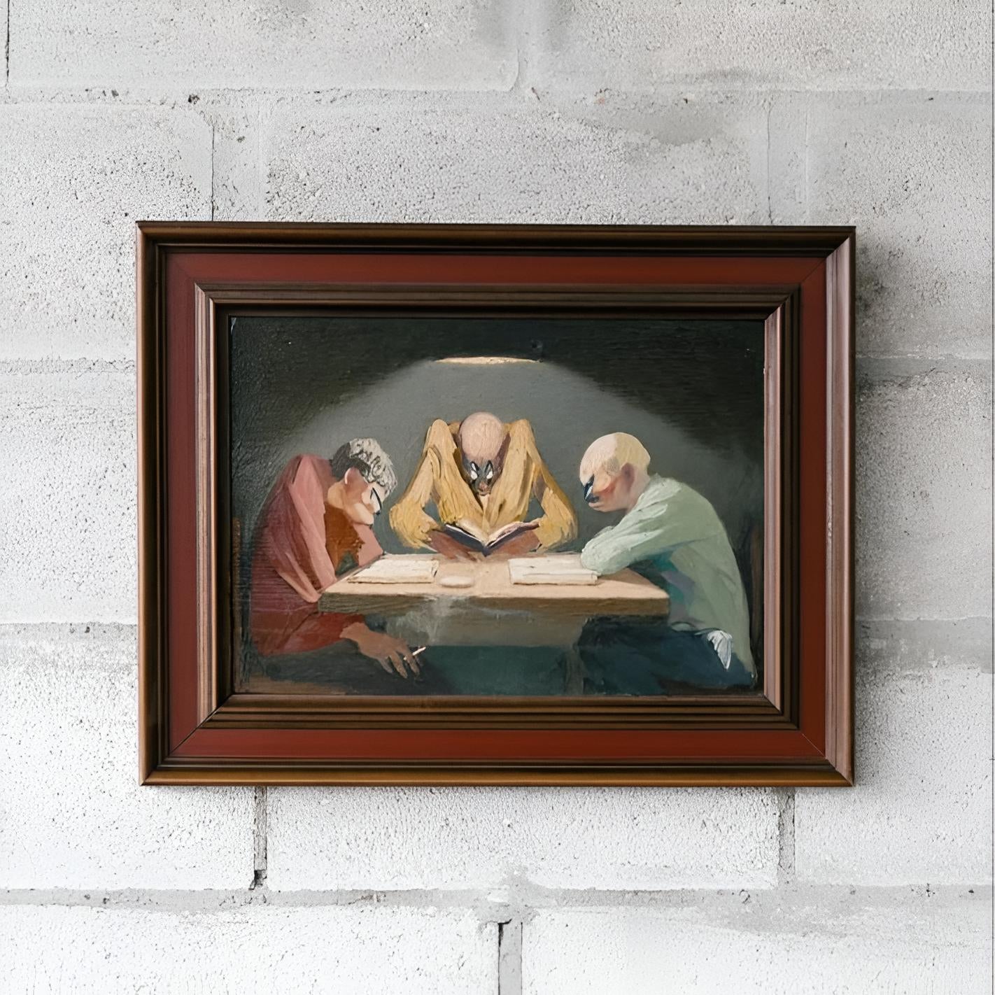 Sumérgete en la profundidad de esta pintura al óleo sobre lienzo de 30x40 cm, una obra intrigante de autor desconocido. La escena, enmarcada en un ambiente oscuro e introspectivo, presenta a tres figuras reunidas en torno a una mesa, absortas en la lectura y el pensamiento. Con una paleta de colores intensos y pinceladas expresivas, la obra transmite una sensación de misterio y contemplación.