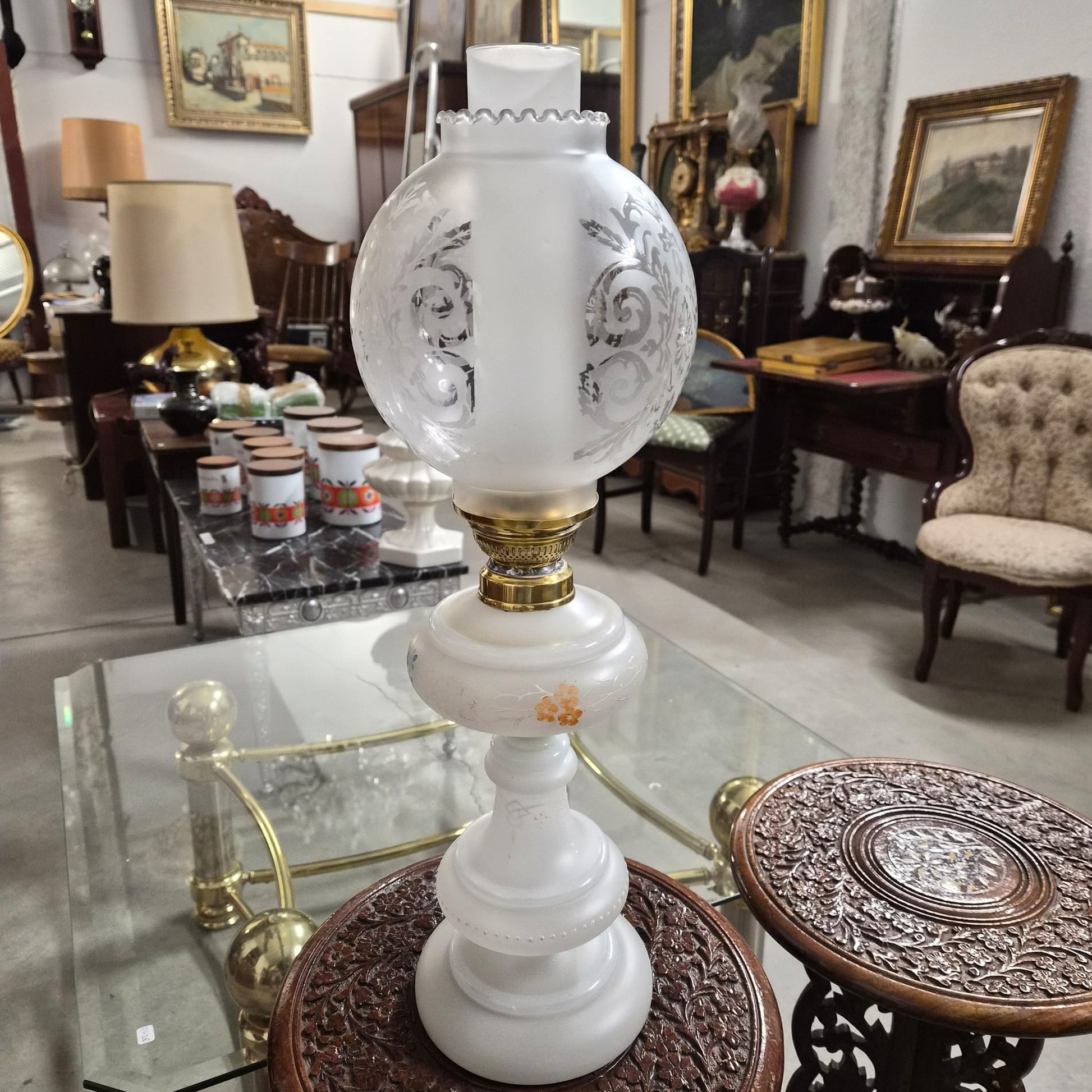 Elegante quinqué antiguo realizado en cristal opalino blanco, con delicada decoración grabada al ácido de motivos vegetales y roleos clásicos. La tulipa globular presenta un refinado trabajo ornamental que tamiza la luz de forma suave y uniforme, creando una atmósfera cálida y acogedora.