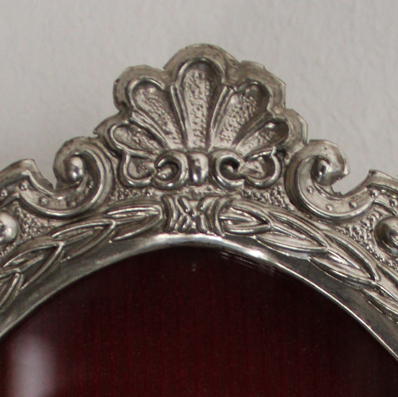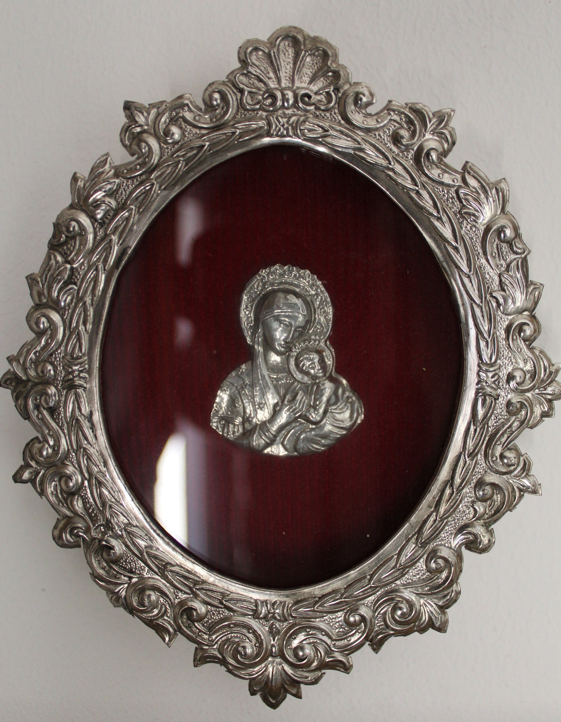 Este hermoso relicario de plata presenta una imagen en relieve de la Virgen María con el Niño Jesús, montada sobre un elegante fondo burdeos. Su marco ovalado de estilo barroco está finamente trabajado en metal plateado con delicados detalles florales, creando una pieza única que combina espiritualidad y arte clásico. Perfecto para coleccionistas, espacios devocionales o como regalo significativo.